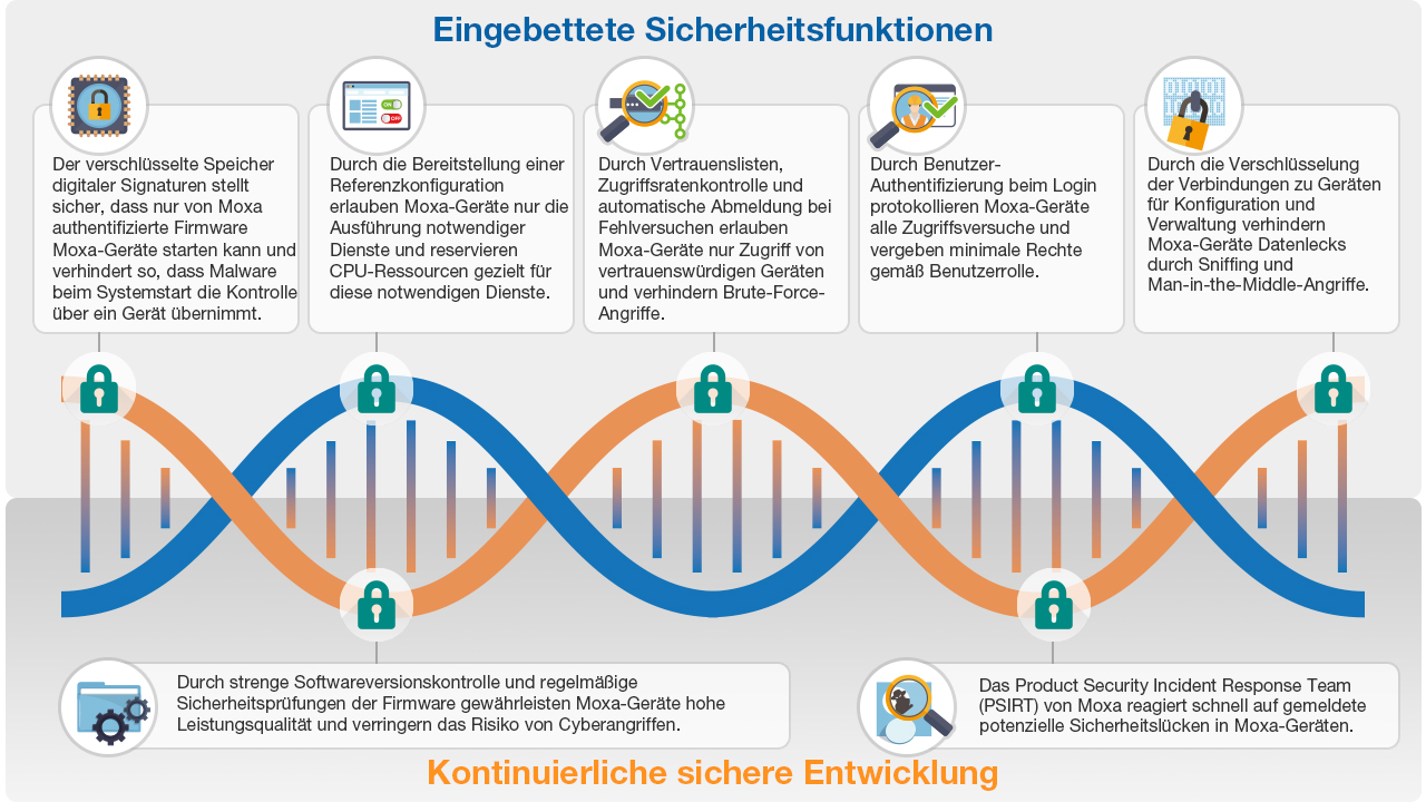 Die sichere DNA unserer Produkte ermöglicht Ihnen den reibungslosen Betrieb bestehender industrieller Systeme. Moxa ist ein nach IEC 62443-4-1 zertifizierter Anbieter industrieller Konnektivitäts- und Netzwerklösungen. Bei der Produktentwicklung orientieren wir uns an den Sicherheitsmerkmalen von IEC 62443-4-2, um eine sichere Produktentwicklung zu gewährleisten. So können Sie die Gerätesicherheit in Ihren industriellen Anwendungen gezielt steigern.