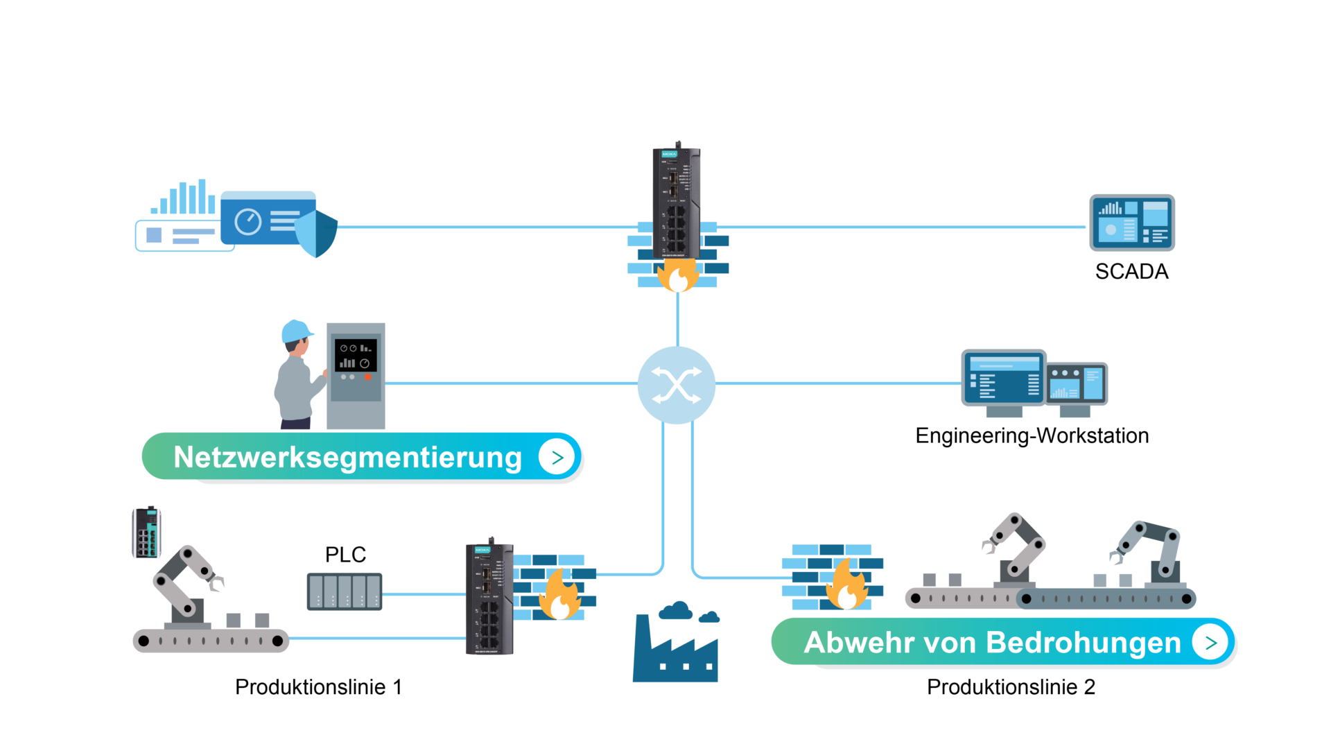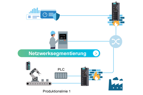 Eine sichere Netzwerkinfrastruktur ist entscheidend für den kontinuierlichen Betrieb industrieller Anlagen. Moxa unterstützt Sie mit sicheren Routern für die Netzwerksegmentierung und mit industrielle Cybersicherheitslösungen, um Netzwerke gezielt abzusichern und kritische Anlagen besser zu schützen.
